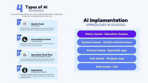 In many cases, the choice of AI tools inadvertently shapes an institution's overall approach to AI implementation (See image for the 4 types of AI currently being used in schools). Here's a generalised overview of common approaches and their associated tools: